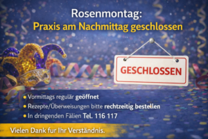 Rosenmontag: Praxis am Nachmittag geschlossen Am Rosenmontag bleibt die Praxis...
